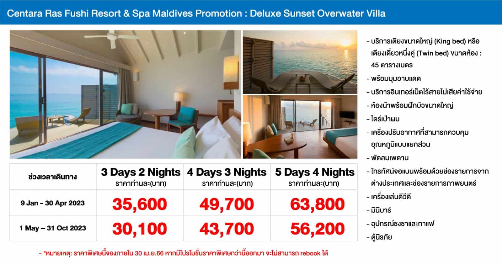 - Centara Ras Fushi Resort & Spa Maldives ไม่อนุญาตให้เด็กอายุต่ำกว่า 12 ปีเข้าพัก*
