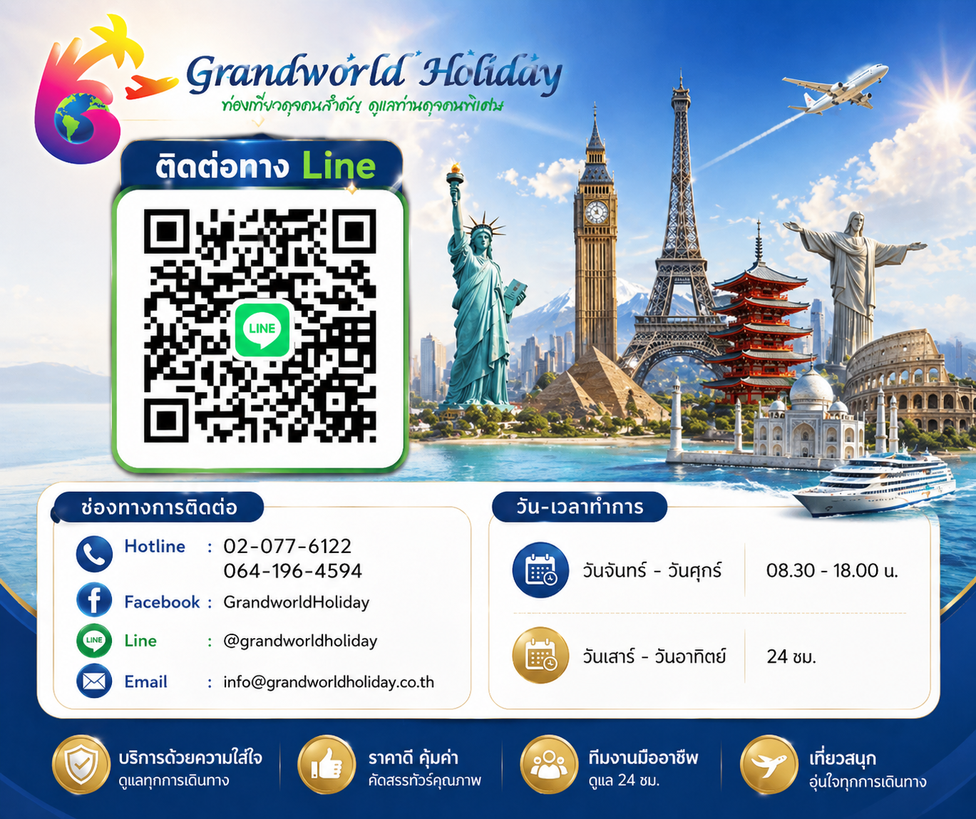 – สามารถติดต่อสอบถามเจ้าหน้าที่ ช่องทางที่สะดวกที่สุด ผ่านทาง Lind ID : @grandworldholiday จะมีเจ้าหน้าที่ค่อยให้บริการตลอด 24 ชั่วโมง